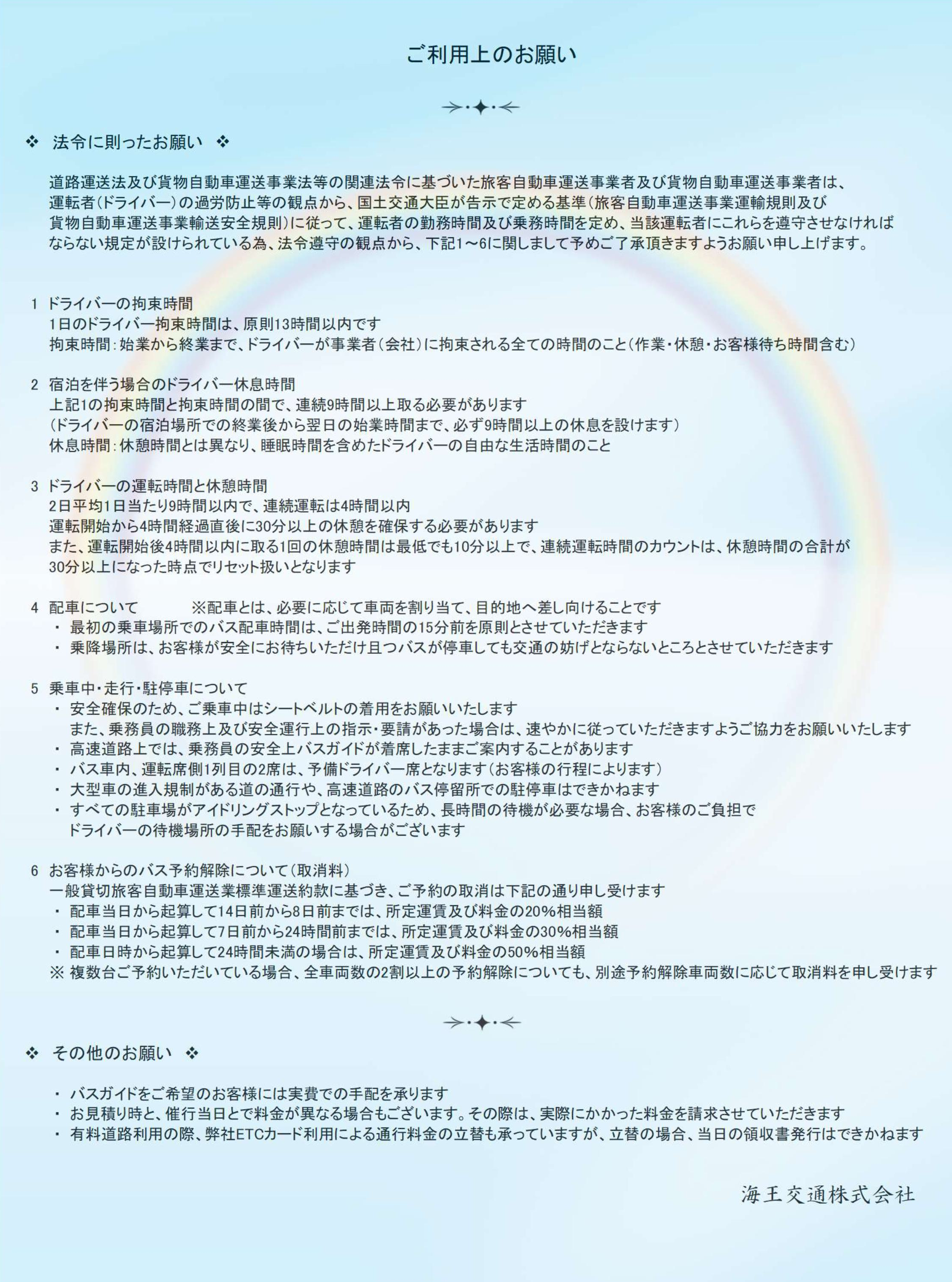 海王交通の貸切バスは、全車両、対人・対物無制限の任意保険に加入済みです。万が一の場合もご安心ください!